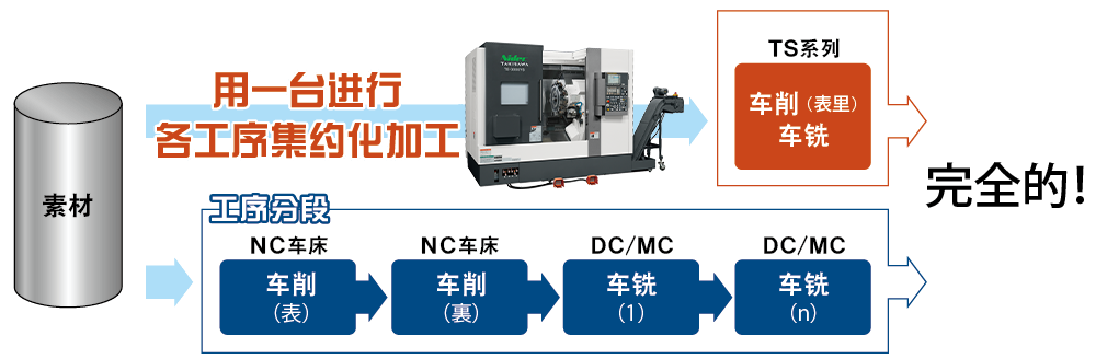 该CNC车床(复合CNC车床)通过强力铣削加工和Y轴控制使高效的工艺集成成为可能。