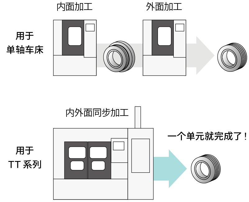 需要两台单轴车床的加工可以在一台机器上完成,减少了周期时间和地面空间。