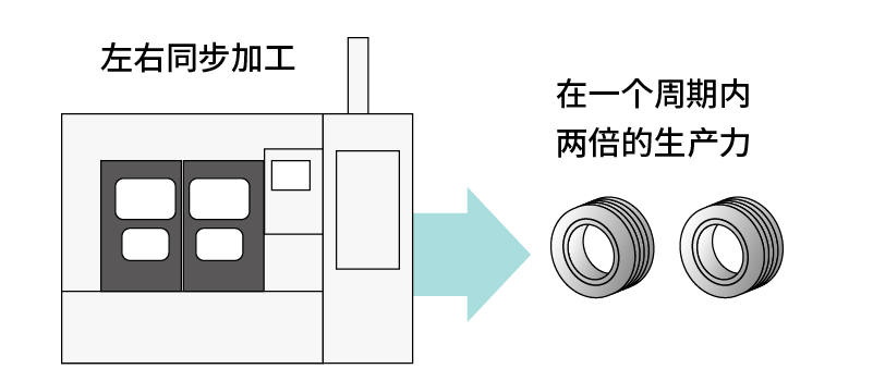 通过在左、右主轴上进行相同的加工,周期时间缩短一半。