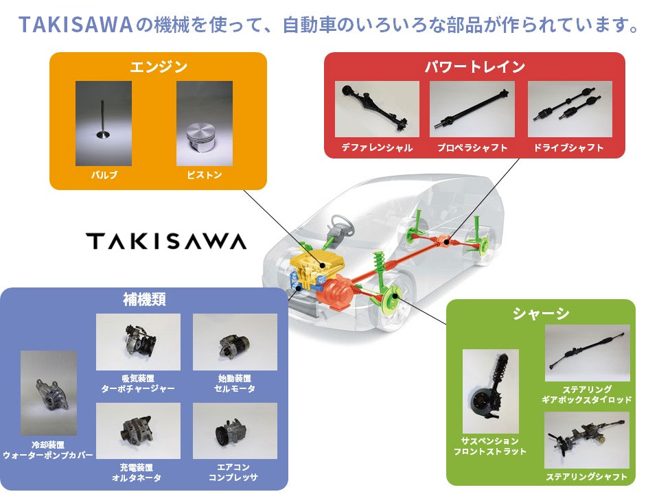 株式会社TAKISAWAは、工作機械の専業メーカーとして、日本のものづくりを支えています。 一例として、身近にある自動車にて、当社製品を使って作ることができる部品を紹介します。