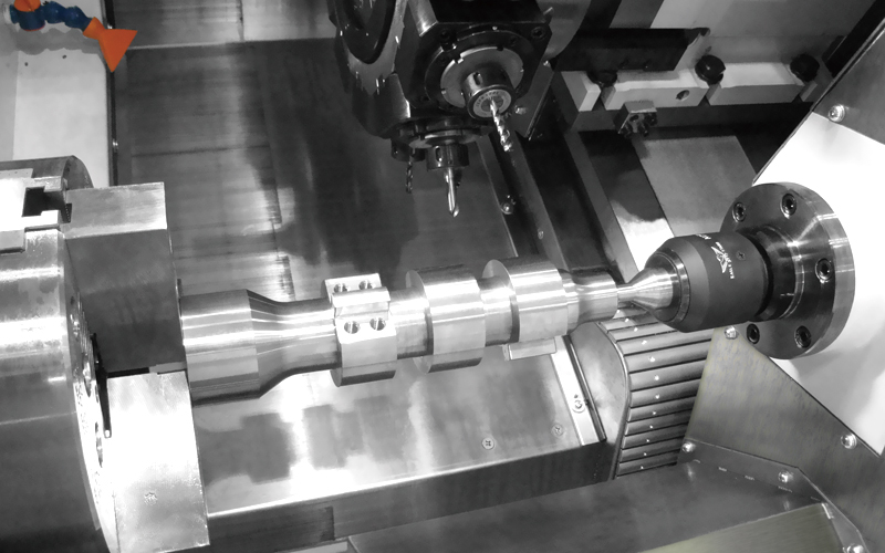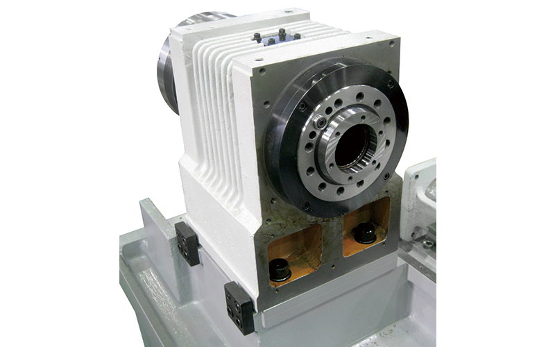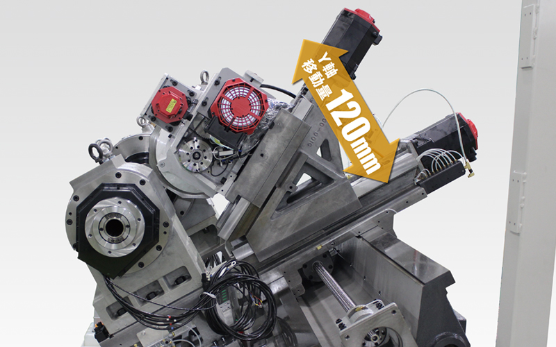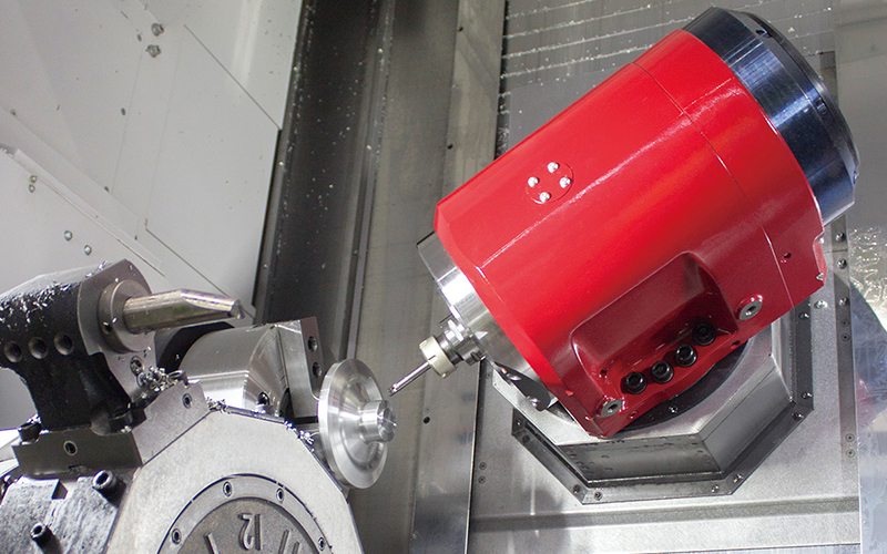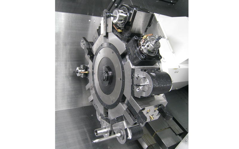 工具主軸 旋盤を複合化したNC工作機械「(旋盤形)複合加工機」に装備される主軸で、旋削加工の他に、回転工具を自動で交換・取付けることによりフライス加工、穴あけ加工が可能。更に、旋回(割出し)しながらの加工も可能。