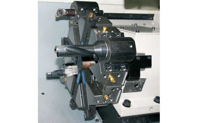 タレット CNC旋盤を構成する主要部品で、工具を取付けるための部品。旋回式で8角~12角が一般的。