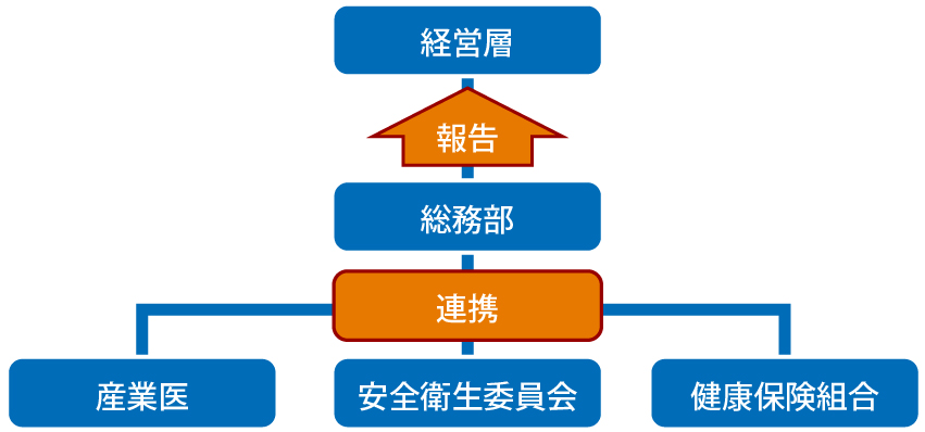 総務部を中心に、各委員や産業医、健康保険組合と連携し、従業員の健康維持・増進に向けた活動をします。必要に応じて、経営層(経営会議等)に、従業員の健康状態や施策の実施状況を報告し、健康経営の継続的な改善を図っています。