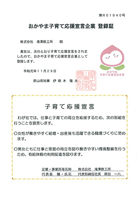 2019年11月29日付で、当社は仕事と子育ての両立を応援するための取組を実践することを宣言し、「おかやま子育て応援宣言企業」に登録されました。 当社は、仕事と子育ての両立を応援するため、積極的な取組に努めてまいります。