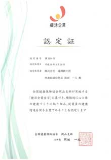 2018年5月、当社は健康経営の考え方を踏まえ、当社の貴重な財産である社員の健康管理や生活習慣病予防に努めることを通じて、社員の健康寿命を延ばすため、社内での心と体の健康管理や健康づくりの取組を実践することを宣言し、全国健康保険協会岡山支部より「健活企業」として認定されました。