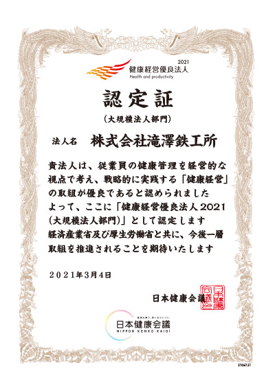 当社は健康管理、メンタルヘルス対策、健康増進(健康づくり)をはじめとした健康配慮の取り組みが評価され、2019年、2020年、2021年に「健康経営優良法人(大規模法人部門)」に認定されました。 心と体の健康づくりを推進し、働きやすい職場環境の実現を目指して従業員の健康保持・増進の周知と意識向上を図るとともに、働くすべての人が持てる力を発揮できるよう健康配慮の取り組みを展開しています。