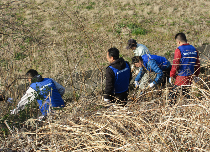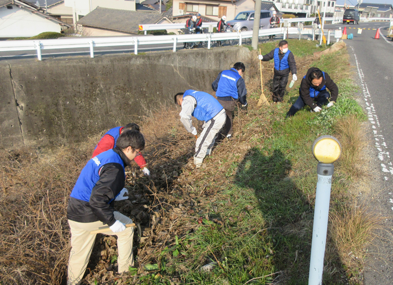当社は、周辺地域の道路や側溝などの清掃活動を定期的に実施しています。また、地域町内会主催の「足守川(岡山市の西部を流れる河川)の土手美化活動」に労使の有志メンバーで参加し、地域の皆様とともに草刈りやゴミ拾いを行っています。