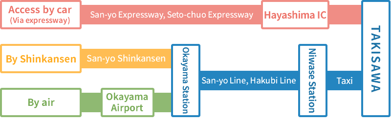 Change to San-yo Line at San-yo Shinkansen Okayama Station and get off at Niwase Station, the second station of the outbound line. Then, take a taxi (Kibi Taxi, etc.) It will take about seven minutes.