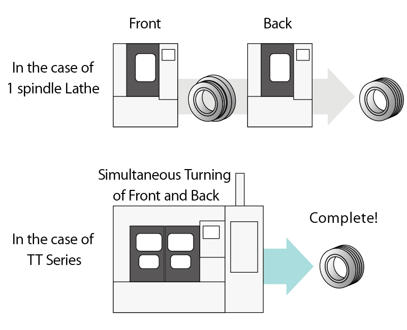 Turning that requires two single-spindle lathes can be completed with a single machine, reducing cycle time and floor space.