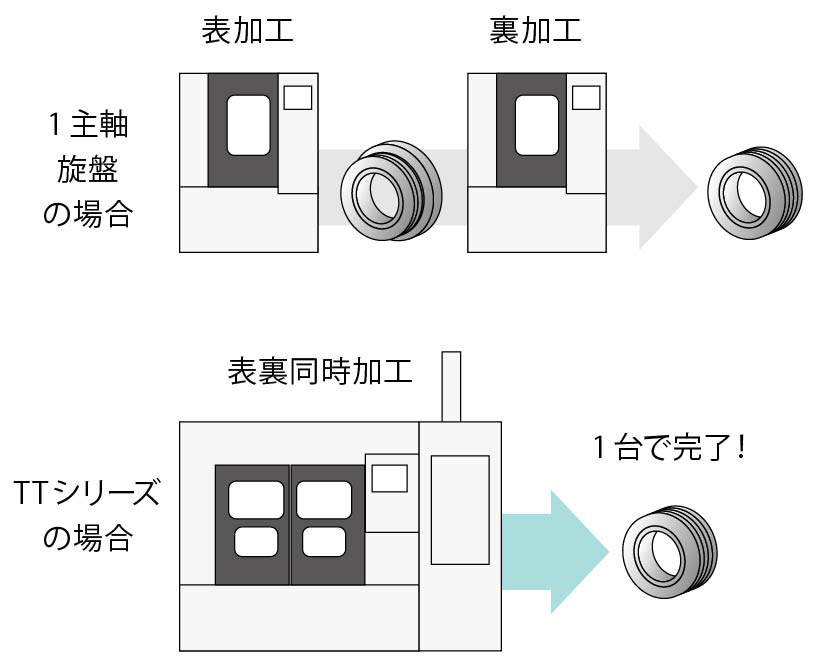 1主軸旋盤では2台必要な加工が1台で完結でき、サイクルタイム、フロアスペースを削減できます。