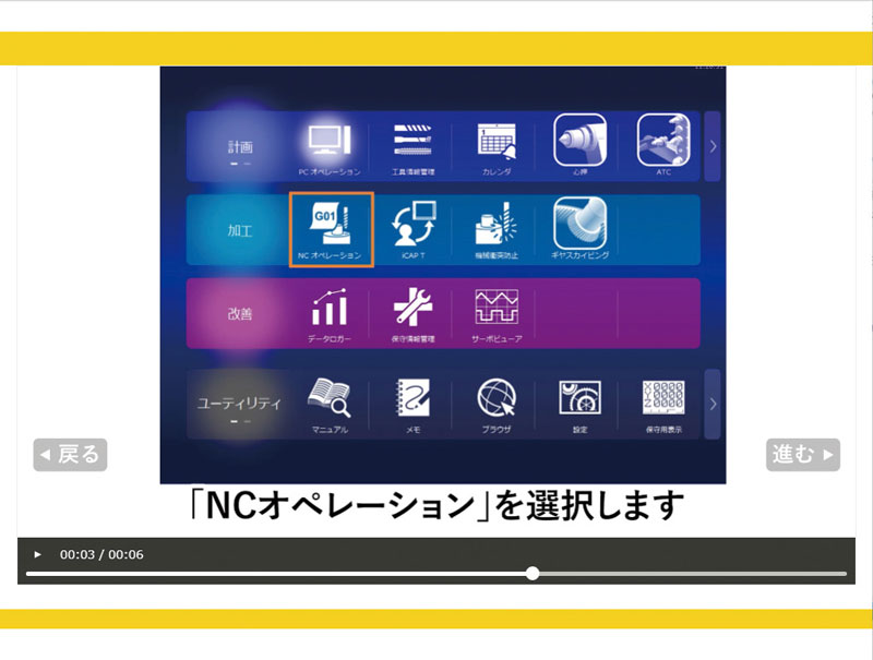 『入力』はGコードを覚えなくても対話形式でかんたんプログラミングできます。『確認』は3Dアニメ描画や工具軌跡描画で切削結果をシミュレーションできます。『運転』は加工主軸や工程種の並びを自動判別し、主軸制御やC軸原点復帰を最適に実行します。