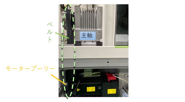 そして中央上にあるのが主軸であり、その左側にベルトとモータープーリーが確認できます。