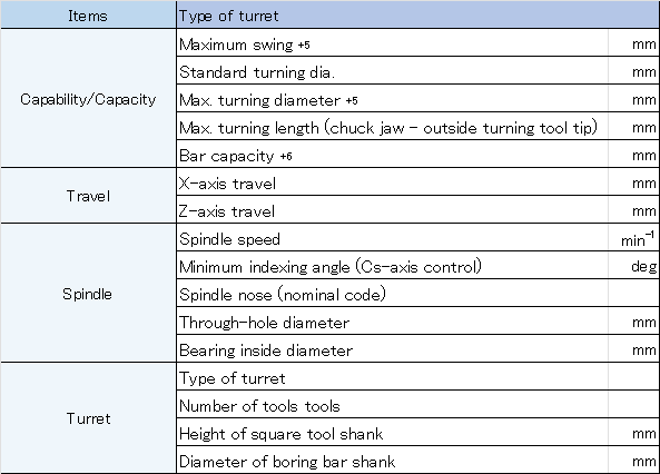 Among the above items, we will pick out “Max. turning diameter”, “Max. turning length”, “X-axis”, and “Z-axis”, which are important words to understand the items “Capability/Capacity” and “Travel”.